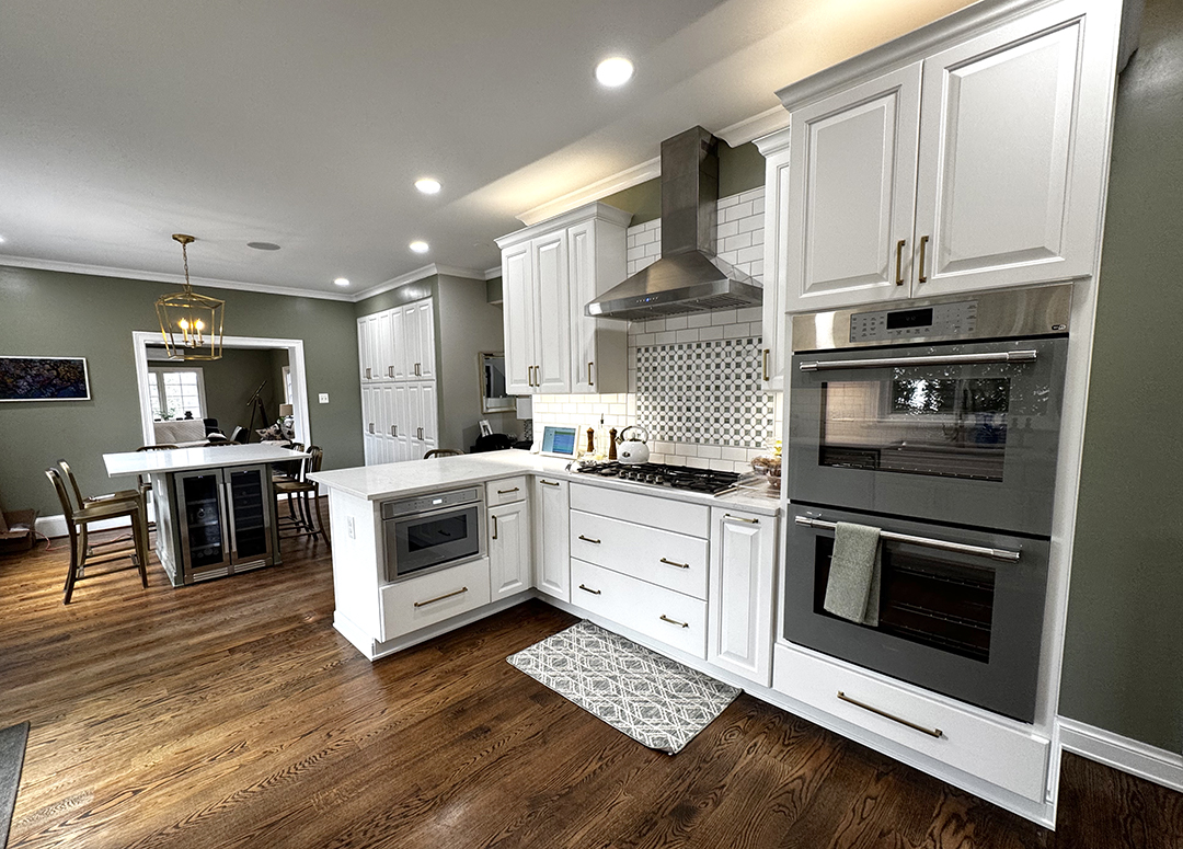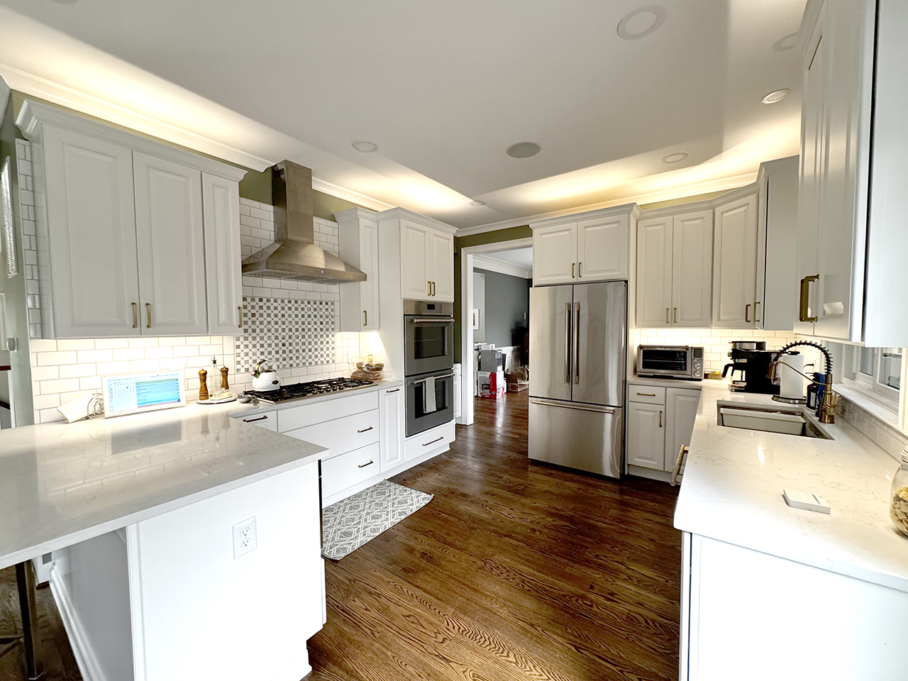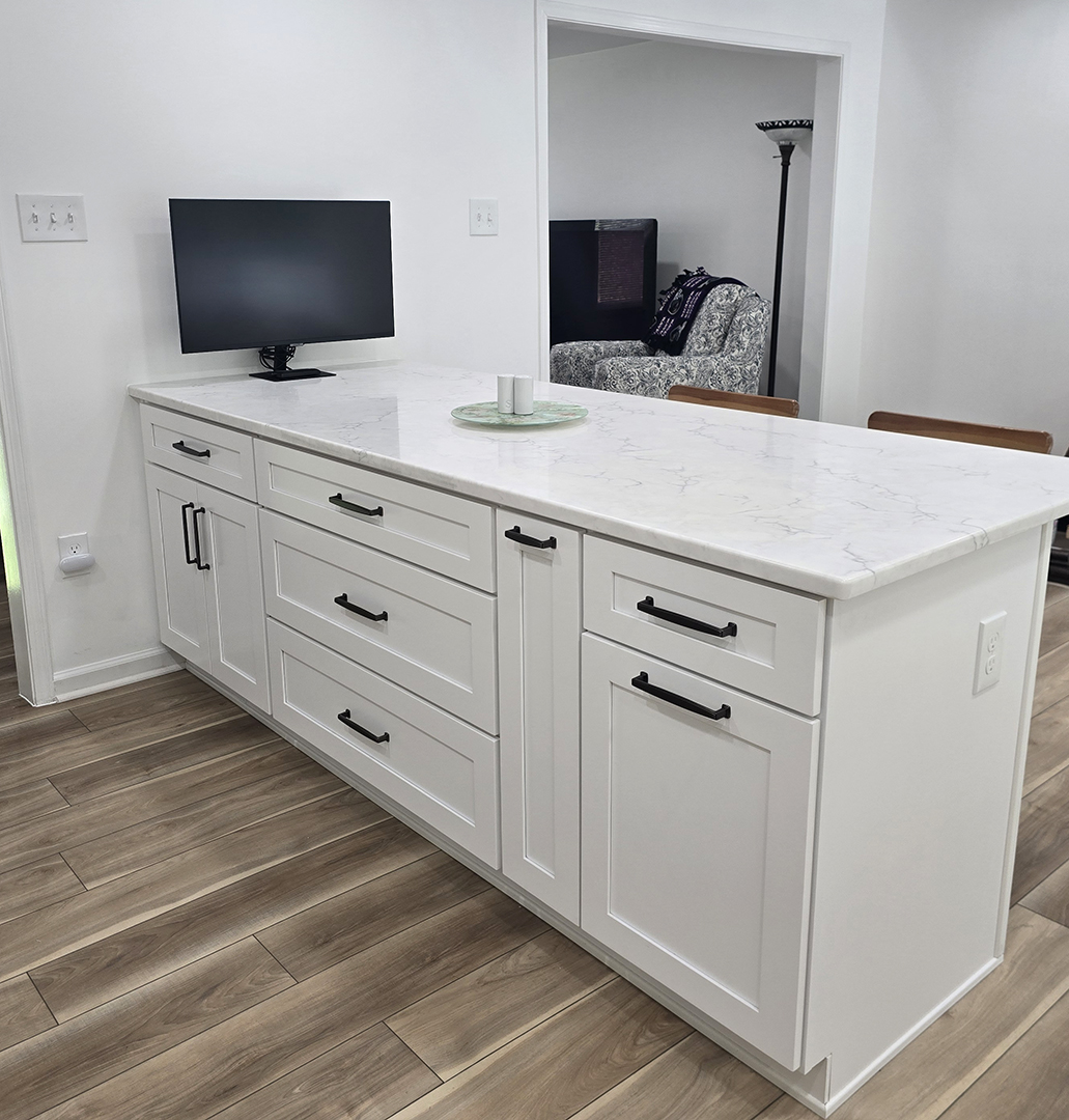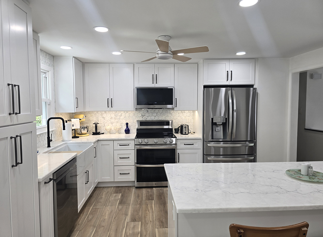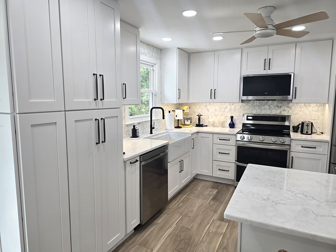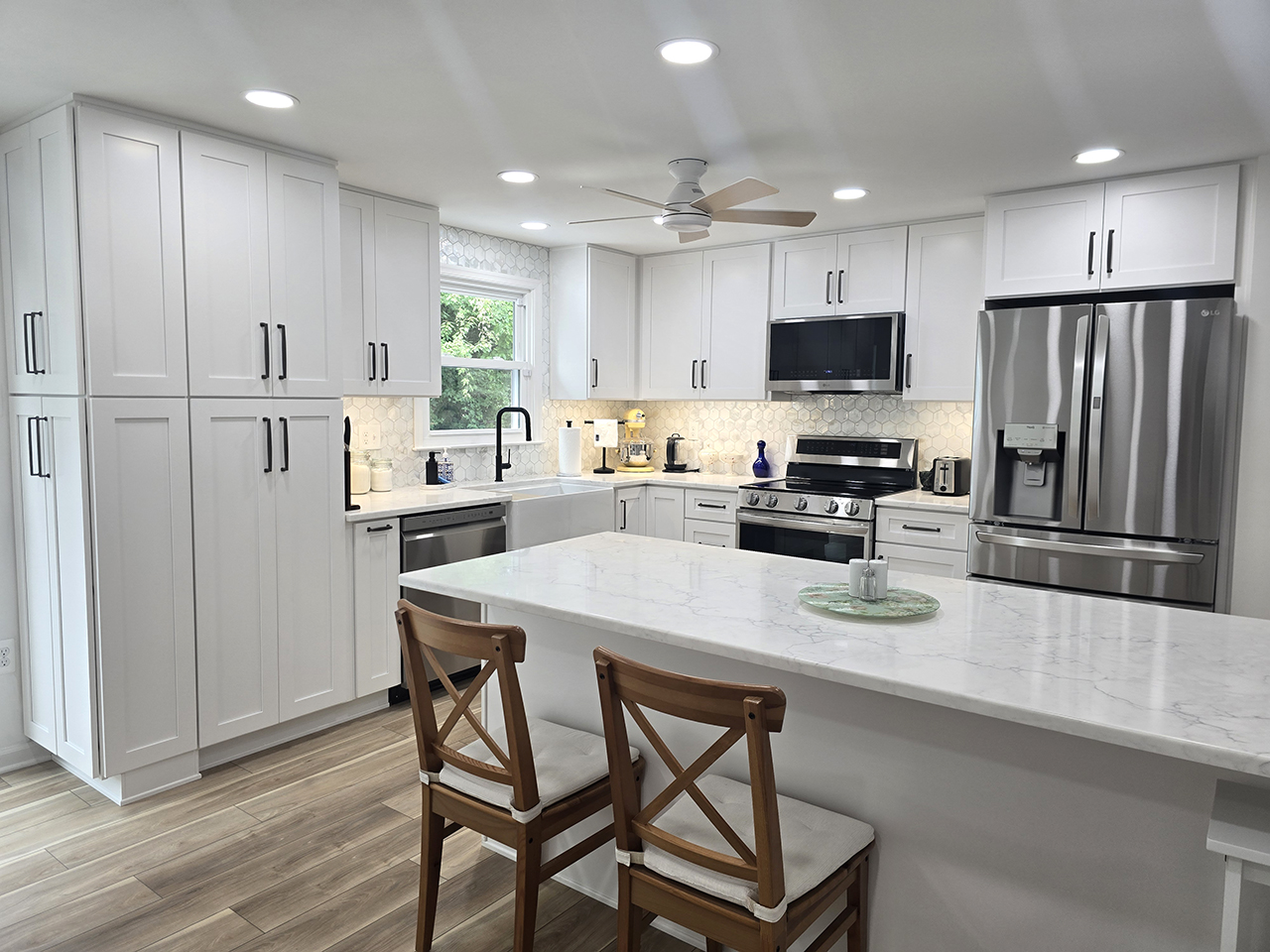 Kitchen Renovation - Parkville • Tribeca Cabinets: Hudson Style, Color: snow white • Counters: Peragama Quartz, Color: Hercules • Hardware: Richard Style, in Brushed Pewter • Flooring - MSI is the distributor, Color: LVP Bayhill Blond