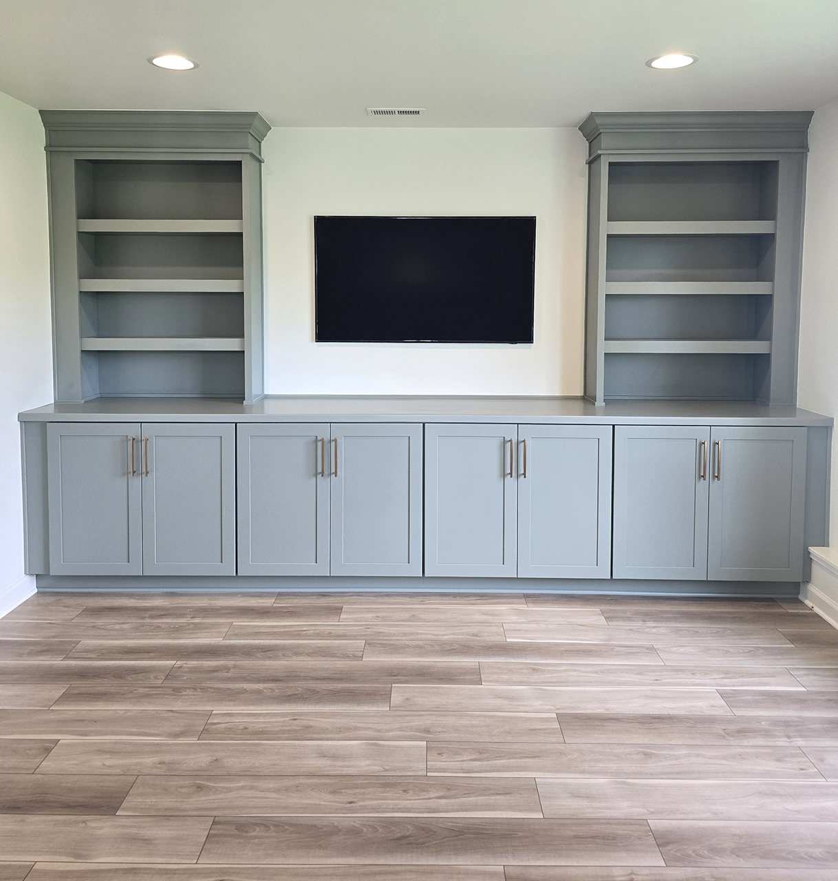 Custom Wall Unit - Nottingham • Fabuwood cabinetry, Galaxy Shaker Style, Color: Pistachio Green • Hardware: Whitock Cabinet Pull in Satin Bronze Finish • Flooring - MSI is the distributor, Color: LVP Bayhill Blond