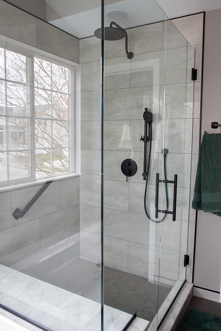 Shower floor is a 1.5" Hexagon Glazed Ceramic Mosaic - color is Ash •